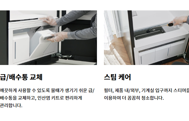 - 스타일러는 물을 이용한 트루스팀 기능이 핵심이므로, 급·배수통을 정기적으로 교체해야 최적의 성능 유지 가능