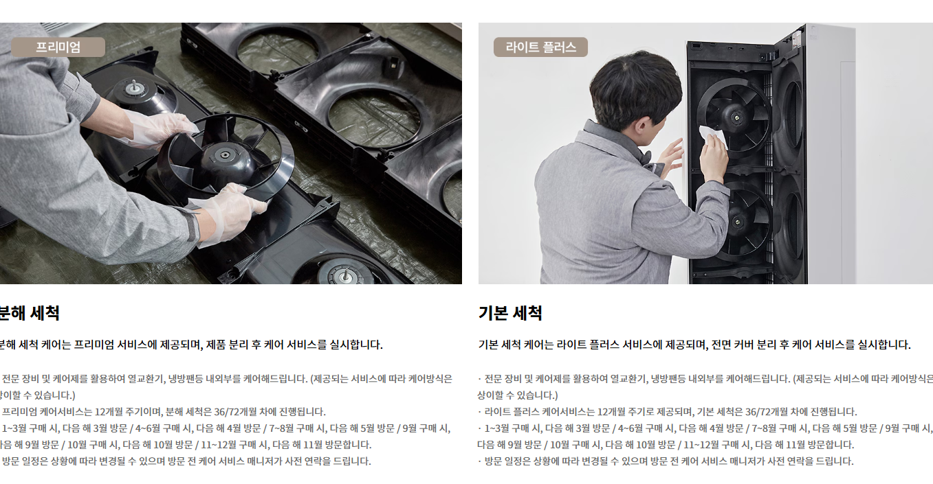 에어컨 속 먼지와 습기, 신경 쓰이시나요? LG 휘센 에어컨은 분해 세척, 필터 관리, 성능 점검, 위생 케어 등을 포함한 프리미엄 구독 케어 서비스를 제공합니다. 정기적인 청소와 유지보수를 통해 더욱 깨끗한 공기와 강력한 냉방 성능을 유지하세요.