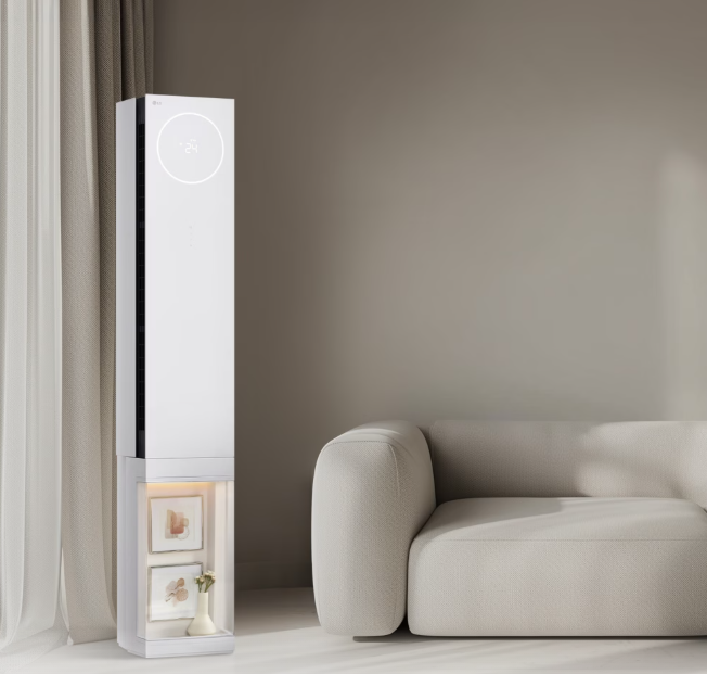 - LG 휘센 오브제컬렉션: 다양한 커스텀 컬러 패널을 제공하여 인테리어와 조화를 이루도록 디자인되었습니다. 하단 패널을 교체하면 뷰케이스로 활용 가능하며, 매거진, 소품, 반려식물 등을 배치할 수 있습니다.